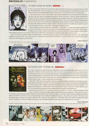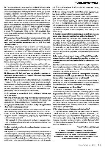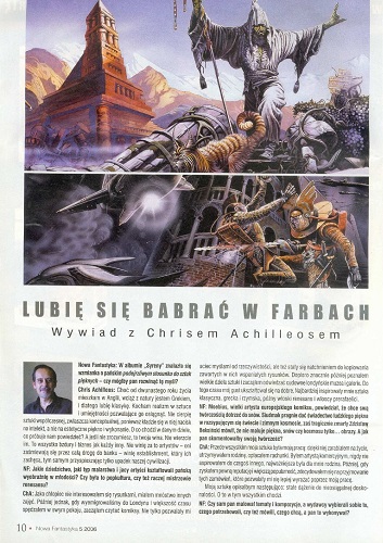 4. Знаменитый американский художник КРИС АХИЛЛЕОС собирается побывать на XIII Международном фестивале фантастике в Нидзице в июле 2006 года. По этому случаю журнал взял у него интервью, которое опубликовано на страницах 10—11 под названием “Lubię się babrać w farbach/Я люблю возиться с красками”.