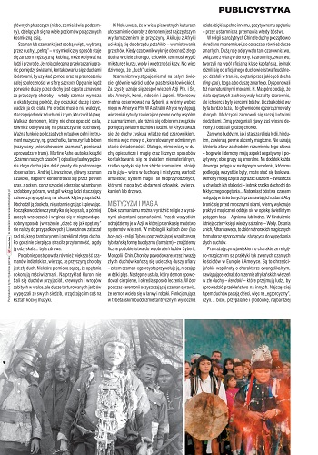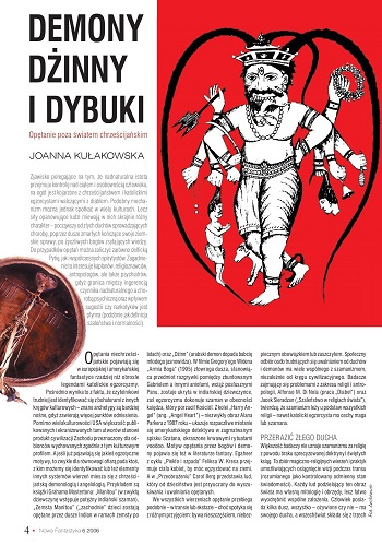 2. В рубрике “Publicystyka” напечатана статья Иоанны Кулаковской/Joanna Kułakowska “Demony, dżinny I dybiki/Демоны, джинны и дыбики” c подзаголовком “Opiętanie poza światem chrześcijańskim /Одержимость вне христианского мира” (стр. 4—7). Большая и весьма информативная статья, где всем сестрам роздано по серьге. Шаманизм северных народов, индейский шаманизм, шаманизм Северной и Средней Азии, обеих Америк, Кореи, Индокитая и Японии. Культ бон (бон-по), ламаизм, тибетский тантрический буддизм, индуизм, черные церкви Европы и Америки, иудаизм, хасидизм, демонология ислама… Список далеко не полон.