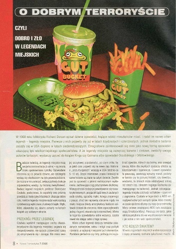 3. В этой же рубрике Михал Студнярек/Michał Studniarek в статье “O dobrym terroryści czyli Dobro I zło w legendach miejskich/О добром террористе, или Добро и зло в городских легендах” рассматривает некоторые из известных городских легенд (стр. 8—9).
