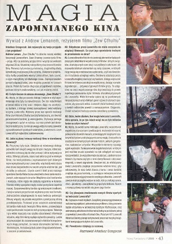 7. Рецензию на фильм “Call of Cthulhu” (реж. Эндрю Леманом, 2005) печатает Аркадиуш Гжегожак/Arkadiusz Grzegorzak (стр. 42), и здесь же публикуется интервью с режиссером этого фильма, которое взял опять же Аркадиуш Гжегожак (стр. 43).