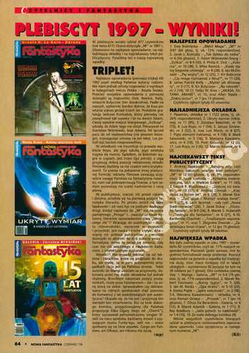 8. В рубрике «Читатели и “Fantastyka”» публикуются результаты читательского опроса относительно выбора лучших журнальных материалов 1997 года. В плебисците участвовали 477 читателей (год назад голосовали 611 читателей). В пятерку лучших рассказов вошли: “Blękit Maga” Евы Бялоленцкой; “Tak daleko do nieba” Яцека Комуды; “Dzikus” Адама Висьневского-Снерга; “Kolonia” Филипа Дика и “Kiedy starszy bogowie umerają” Майка Резника. Оценивались также обложки, публицистика, неудачные материалы (стр. 64).