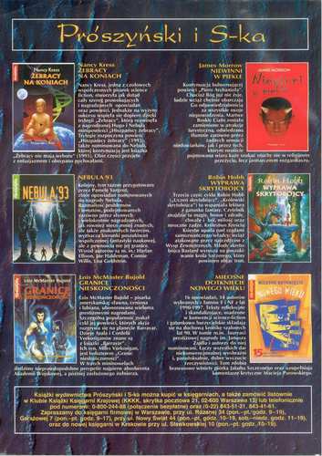 9. Далее в рубрике «Среди фэнов» размещены небольшие заметки о пятилетнем юбилее издательства «MAG», о сотом номере фэнзина «Miesięcznik ŚKF», о изрядно припоздавшем номере (4/1997) журнала «SFinks», о неудачной апрельской дискуссии о фэнтези в WOK (стр. 65).