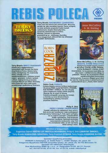 Яцек Дукай/Jacek Dukaj по обыкновению разбирается с целым циклом – на этот раз речь идет о цикле американского писателя Глена Кука «Хроники Черного отряда» (Glen Cook “Kroniki Czarnej Kompanii” (“Czarna Kompania” – это “The Black Company”, 1984; “Cień w ukryciu” – это “Shadow Linger”, 1984; “”Biala Róża” – это “The White Rose”, 1985; “Gry cienia” – это “Shadow Games”, 1989; “Srebrny grot” – это “The Silver Spine”, 1989; “Sny o stali” – это “Dreems of Steel”, 1990). Tłum. Michał Jakuszewski (I-II); Beata Jankowska-Rosadzińska (III); Jan Karłowski (IV-VI). “Rebis”, 1993-1996. Серия Fantasy”);