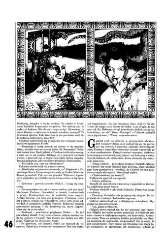 10. В рубрике «Felietony» размещены: начало большой статьи Анджея Сапковского«Miecz, magia, ekran/Меч, магия, экран» -- о его личном отношении к фильмам фэнтези (стр. 76); статья Анджея Колодыньского/Andrzej Kołodyński “Zmiana perspektywy/C другой точки зрения” – о несколько необычной интерпретации образов главного героя (героев) новеллы Стивенсона «Доктор Джекил и мистер Хайд» в кино (фильм «Доктор Джекил и мисс Хайд») (стр. 77); и статья Адама Холлянека/Adam Hollanek «Rewolucja w mediach/Революция в средствах массовой информации», в которой он высказывает опасение о том, что компьютер вот-вот окончательно вытеснит книгу из повседневного обихода (стр. 77).