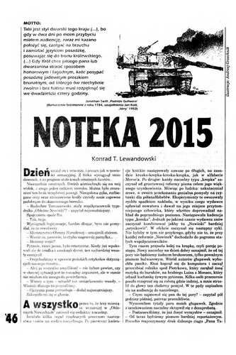 И, наконец, гвоздь номера – рассказ «Noteka 2015/Нотека 2015», о… польско-американской войне, который написал уже хорошо нам знакомый Конрад Левандовский/Konrad T. Lewandowski (стр. 46-56). (Основное сражение сей странной войны происходит в Нотецкой пуще, Нотеце, которую американцы зовут Нотекой – отсюда и название рассказа. И, кстати, это одна из (немногих) вещей, о которых я с дрожью в руках думаю: ну почему, почему не я это написал?! W.). Иллюстрации АНДЖЕЯ ГЖЕХНИКА/Andrzej Grzechnik.