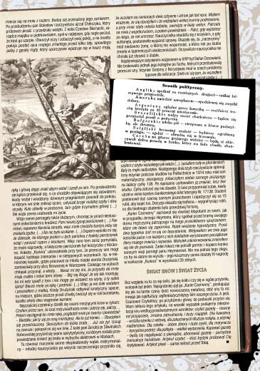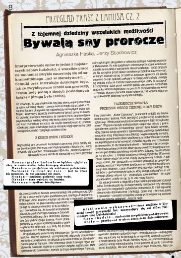 3. В этой же рубрике напечатана вторая часть статьи польских журналистов Агнешки Хаски, Ежи Стахович “Przegląd prasy z lamusa. Cz. 2/Обзор прессы из чулана. Ч. 2” – «Bywają sny prorocze/Бывают пророческие сны” (стр. 8—9). Вот всякого такого этого полным-полно в прессе всего мира. И не только в газетах и журналах 20-х – 30-х годов межвоенной Польши. Стоит начаться так называемому «огуречному сезону», нечто такое и появляется. Сонники – трактовка снов. Якобы сбывшиеся сны… Не будем мы к этому возвращаться.