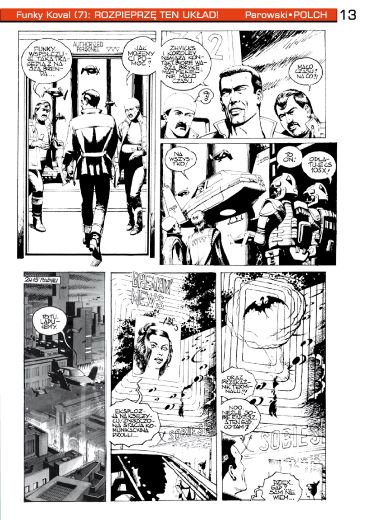 5. Напечатаны дальнейшие четыре черно-белые панели нового «Фанки Коваля» (стр. 13—16). Две из них приведены ниже. Комикс называется “Rozpierzę ten układ/Раздолбаю этот пакт”.