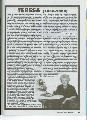6. Далее следует некролог, подписанный Мацеем Паровским и посвященный памяти Терезы Пайдзиньской/Teresa Pajdzińska (22 июля 1934 – 07 июня 2000) – бессменного корректора журнала “Fantastyka/Nowa Fantastyka” с самого первого номера (стр. 65)
