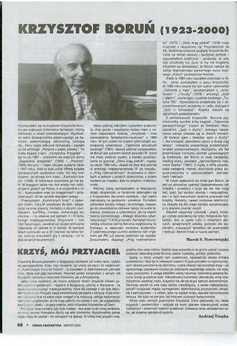 7. И еще две публикации подобного характера – небольшая статья журналиста и книгоиздателя Марека Нововейского/Marek S. Nowowejski «Krzysztof Boruń. 1923 – 2000/Кшиштоф Борунь. 1923 — 2000» (стр. 66) и заметка писателя-фантаста, соавтора и друга Боруня Анджея Трепки/Andrzej Trepka «Krzyś, mój przyjaciel/Кшись, мой друг” (стр. 66). К статье Нововейского я вернусь чуть позже.