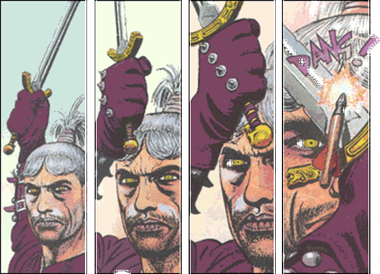 У него белые (седые?) волосы, но он не старик, потому что мечом машет и в бою вертится так, что ой-ой-ой. В нем слишком много от мудреца, философа и моралиста, так что лицо-маска культуриста Конана-Шварценеггера ему не идет. Нарисованный в штанах – напоминает чиновника, без штанов – ну смех да и только. «Богусь, литература это именно то, что трудно нарисовать», -- поучающе изрек я, хоть и почувствовал, что потчую его слишком общей сентенцией.