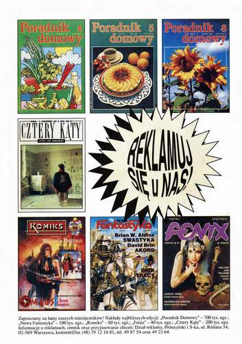 Cентябрьский номер 1991 года (15-й «Новой Фантастыки» и 108-й, если считать ab ovo) делает сложившаяся в предыдущем номере редакторская команда -- если ограничиться в перечислении творческими работниками, это Анджей Бжезицкий/Andrzej Brzezicki (художественный и оформительский отдел), Лех Енчмык/Lech Jęczmyk (главный редактор), Славомир Кендзерский/Sławomir Kędzierski, Дорота Малиновская/Dorota Malinowska (иностранный отдел), Марек Орамус/Marek Oramus (отдел публицистики и критики), Мацей Паровский/Macej Parowski (отдел польской литературы, заместитель главного редактора). В списке постоянных сотрудников перечислены: Адам Холлянек/Adam Hollanek, Яцек Инглëт/Jacek Inglot, Аркадиуш Наконечник/Arkadiusz Nakoniecznik, Анджей Невядовский/Andrzej Niewiadowski, Яцек Родек/Jacek Rodek, Дарослав Ежи Торунь/Darosław Jerzy Toruń, а также Karburator, Kunktator, Negocjator, Predator, Sekator и Wibrator. Тираж – 100 тысяч экземпляров. В оформлении передней обложки использована работа испанского художника ВИСЕНТЕ СЕГРЕЛЛЕСА/Visente Segrelles. В «Галерее» вновь гостит английский художник КРИС ФОСС. Репродукции его работ, почерпнутые из выпущенного в 1990 году издательством «Dragon’s World» альбома «Diary of a Spaceperson», расположены на внутренней стороне передней обложки, а также на страницах 17 -- 24, 57 -- 60 и на внутренней стороне задней обложки. Интересна не типичная для ФОССА концепция альбома: в нем главными героями являются люди, а не космические корабли, как это было прежде. ФОСС не только создал изобразительный ряд альбома, но и сам написал текст к нему. Цикл великолепных цветных картин, где представлены космос, межзвездные путешествия, космические войны, соотносится с параллельно печатающимся дневником, якобы найденным в развалинах города Новая Венеция на одной из покинутых людьми планет. Девушка по имени J не только писала этот дневник, но и иллюстрировала его своими рисунками, благодаря чему читатель/зритель знакомится с историей ее жизни и историей гибели родного ей общества в результате захвата планеты космическими пиратами. На внешней стороне задней обложки рекламируются журналы “Poradnik domowy/Домашний советчик” (о ведении домашнего хозяйства), “Cztery kąty/Четыре угла” (о жилье), “Komiks/Комикс”, “Nowa Fantastyka/Новая фантастика”, “Fenix/Феникс” (фантастика) – издающиеся фирмой “Prószyński i S-ka”. Интересно сравнить тиражи: «Домашний советник» -- 700 тысяч, «Четыре угла» -- 200 тысяч, «Комикс» -- 80 тысяч, «Новая фантастика» -- 100 тысяч, «Феникс» -- 40 тысяч экземпляров. И последнее: уже при беглом осмотре содержания этого номера журнала можно заметить преобладающее в названиях материалов имя. И это правильно – в качестве поздравления Станислава Лема c 70-летним юбилеем в журнале напечатан ряд статей о нем, его книгах и его героях, а также интервью, взятое у Мастера его чешским переводчиком.