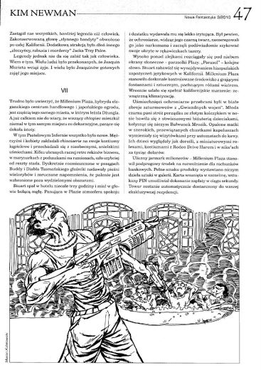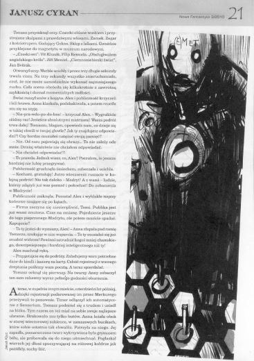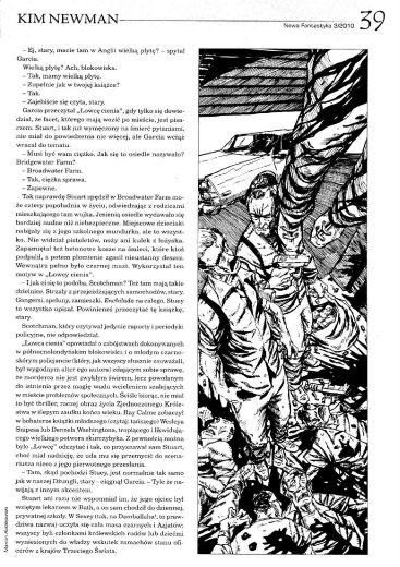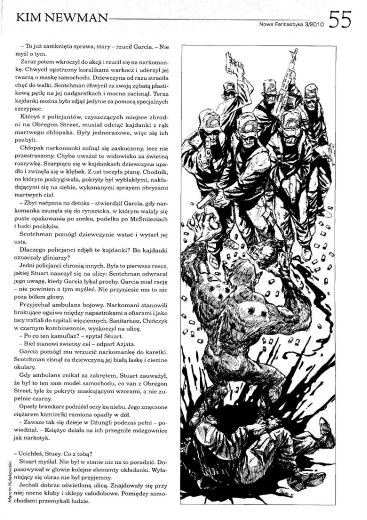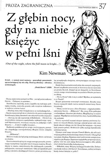 19. В рубрике «Иностранная фантастика» напечатана повесть британского писателя Кима Ньюмана/Kim Newman, которая в оригинале называется “Out of the Night, when the Full Moon bright…” (1994, ант. “The Mammoth Book of Werewolves”; 1995, авт. сб. “Famous Monsters”; 1995, ант. “The Giant Book of Werewolves”). На польский язык ее перевел под названием “Z głębin nocy, gdy na niebie…/Из глубины ночи, когда на небе…” ГЖЕГОЖ КОМЕРСКИЙ/Grzegorz Komerski (стр. 37--64). Иллюстрации МАРЦИНА КУЛАКОВСКОГО/Marcin Kułakowski.