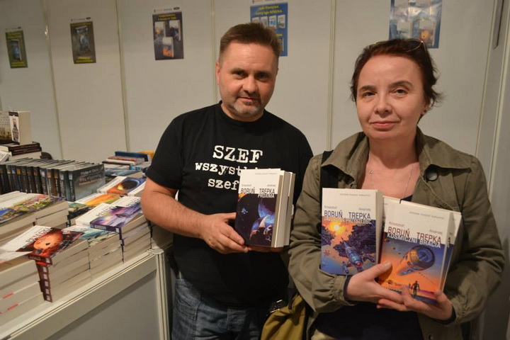 Их дочь Катажина (ныне Борунь-Ягодзиньска/Katarzyna Boruń-Jagodzińska) (род. 1956), замечательная поэтесса, переводчица с чешского и словацкого, журналистка – родила Боруню внуков, с которыми он успел вдоволь повозиться. Она чтит память отца, и многие из представленных здесь фотодокументов происходят из ее домашнего архива. Вот еще одна фотография с Полкона – 2013, где она с книгами отца и их издателем.