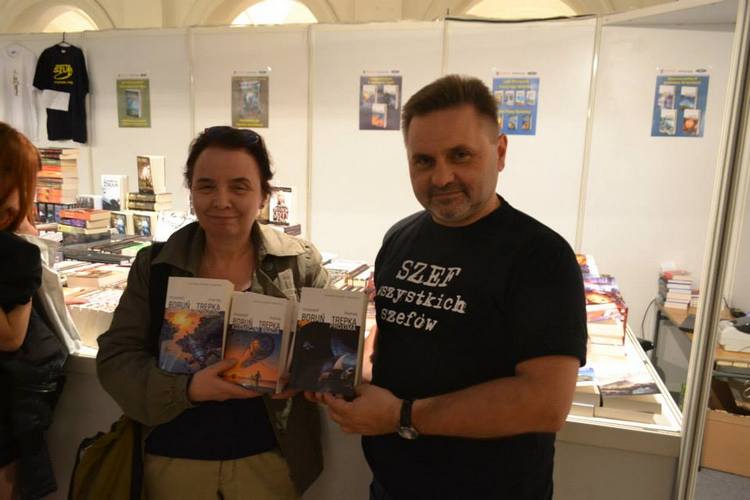 Их дочь Катажина (ныне Борунь-Ягодзиньска/Katarzyna Boruń-Jagodzińska) (род. 1956), замечательная поэтесса, переводчица с чешского и словацкого, журналистка – родила Боруню внуков, с которыми он успел вдоволь повозиться. Она чтит память отца, и многие из представленных здесь фотодокументов происходят из ее домашнего архива. Вот еще одна фотография с Полкона – 2013, где она с книгами отца и их издателем.