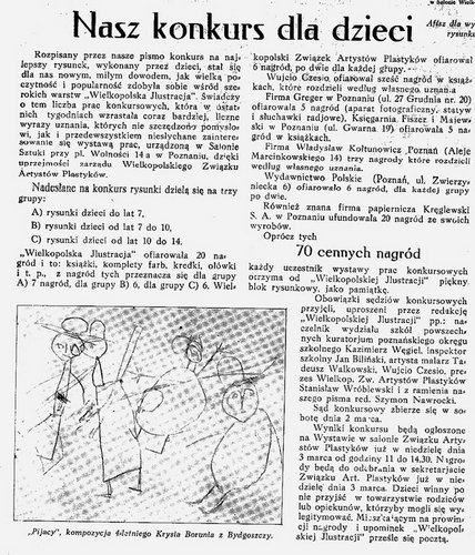 Кшиштоф Борунь/Krzysztof Boruń родился 29 ноября 1923 года в городе Ченстохове. Начальную школу и гимназию закончил в городе Быдгощ, лицей – в Варшаве. Творческие способности проявил очень рано – смотрите ниже объявление о конкурсе детского рисунка, объявленном газетой «Wielkopolska Ilustracja», оснащенное рисунком 4-летнего Кшися Боруня из Быдгощи.