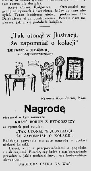 Рисунок, кстати, называется «Пьяницы/Pijacy», и его вполне можно считать дебютным. Талантливый мальчуган не терял связи с газетой «Wielkopolska Ilustracja» и в дальнейшем, чему может свидетельствовать следующая газетная вырезка. На ней не только рисунок, за который уже 9-летний Кшись получил награду (интересную книжку), но и стихотворная подпись к нему: «Tak utonął w Ilustracji, że zapomniał о kolacji/Так утонул в “Иллюстрации”, что забыл об ужине (уж простите за прозаический подстрочник)», которую вполне можно считать поэтическим дебютом.