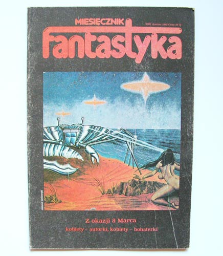 Бумага, объем, типография, тираж (150 тыс.) и прочее – все те же, только теперь за художественное оформление журнала наравне с АНДЖЕЕМ БЖЕЗИЦКИМ отвечает МАРЕК ЗАЛЕЙСКИЙ/Marek Zalejski. На передней странице обложки репродукция картины ЯНУША ГИНЕВСКОГО/Janusz Giniewski (Вроцлав), отобранной из присланных на конкурс произведений. Завершает журнал обложка к повести Джеймса Типтри-младшего, печатающейся в этом номере журнала, которую изготовил ЕЖИ ВРУБЛЕВСКИЙ/Jerzy Wróblewski (возможно, я прицеплю ее к этой части поста чуть позже). Поскольку номер мартовский, а редакция почти (корректор -- женщина) сплошь представители мужеска полу (до появления в ее составе Дороты Малиновской/Dorota Malinowska еще ждать и ждать), решено было отдать номер на откуп прекрасной половине рода человеческого. И вот что получилось.