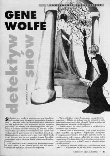3. Рассказ американского писателя Джина Вулфа/Gene Wolfe, который называется в оригинале ”The Detective Dreams” (1980, ант. “Dark Forces”; 1983, ант. “Macaber Carnaval”, 1989, авт. сб. “Endangered Species”), перевел на польский язык под названием ”Detektyw snów/Детектив снов” АРКАДИУШ НАКОНЕЧНИК/Arkadiusz Nakoniecznik (стр. 13-16; 25-28). Иллюстрации ПАТРИЦИИ МОРАН/Patrycja Moran.
