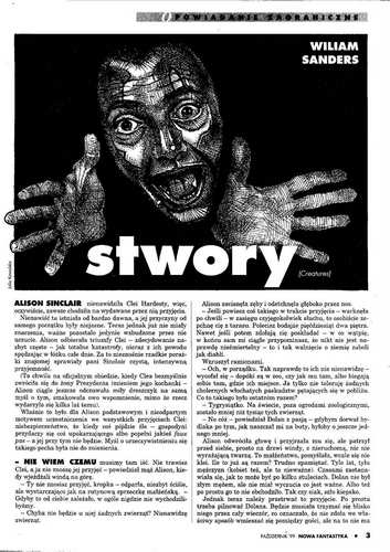 1. Рассказ американского писателя Уильяма Сандерса/William Sanders, который называется в оригинале “Creatures” (1999, “Nowa Fantastyka”, № 10; 2000, ант. “The Age of Wonders: Tales from the Near Future”; 2008, авт. сб. “East of the Sun and West of Fort Smith”), перевел на польский язык под названием “Stwory/Твари” ЯРОСЛАВ ЦЕСЬЛЯ/Jarosław Cieśla (стр. 3-9). Иллюстрации ЮЛИИ КОВАЛЬСКОЙ/Julia Kowalska.