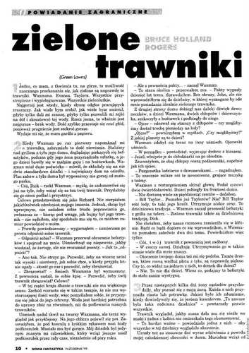 2. Рассказ американского писателя Брюса Холланда Роджерса/Bruce Holland Rogers, который называется в оригинале “Green Lawns” (1992, “Amazing Stories”, Nov.), перевел на польский язык под названием “Zielone trawniki/Зеленые газоны ” ПАВЕЛ МАРТИН/Paweł Martin (стр. 10-12). Иллюстрации РАФАЛА ЛОБОДЗИНЬСКОГО/Rafał Łobodziński.