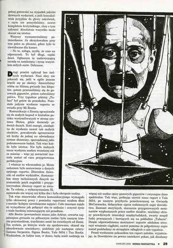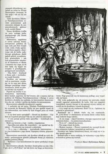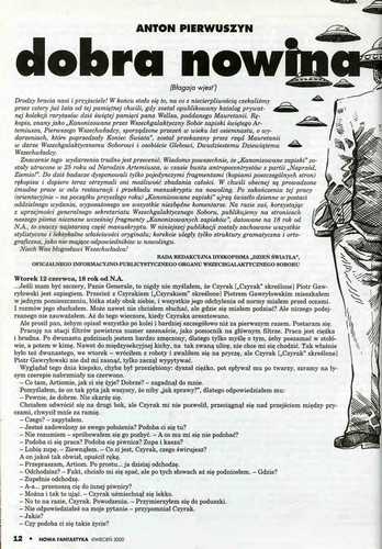 3. «Контактно-политический» (Мацей Паровский) рассказ российского писателя Антона Первушина, который называется в оригинале «Благая весть» (1999, ”Порог”; 2008, ант. “Близкий контакт”), перевел под адекватным названием “Dobra nowina/Благая весть” ЭУГЕНЮШ ДЕМБСКИЙ/EuGeniusz Dębski (стр. 12-16). Иллюстрации ПЕТРА КОВАЛЬСКОГО/Piotr Kowalski.