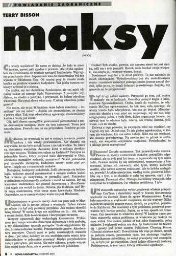 2. Рассказ американского писателя Терри Биссона/Terry Bisson, который называется в оригинале “macs” (1999, “The Magazin of Fantasy and Science Fiction”, Okt.-Nov.; 2000, авт. сб. “In the Upper Room and Other Likely Stories”; 2000, ант. “Year’s Best SF – 5”) перевел на польский язык под названием “maksy/максы” МАРЦИН ВАВЖИНЬЧАК/Marcin Wawrzyńczak (стр. 8-11). Иллюстрации МАРЦИНА КОПЦЮХА/Marcin Kopciuch.