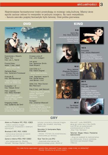 1. Под заголовком “Fantastyczny luty/Фантастический февраль” напечатаны списки анонсов – издающихся в Польше книг и комиксов, а также кинофильмов, DVD, компьютерных игр и телесериалов (стр. 2–-3).