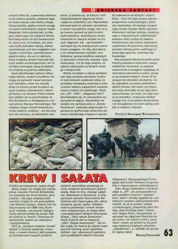4. В рубрике «Кино и НФ» Яцек Инглет/Jacek Inglot в заметке ”Miasto zaginionyczh sensów/Город пропавших смыслов” довольно едко проходится по фильму французского режиссера Жан-Пьера Жене “Le cite des enfants perdus/Город пропавших детей” (Франция-Испания-Германия, 1995) (стр. 57-58), что пытается уравновесить Мацей Паровский репликой «Logika snu/Логика сна» (стр. 58). Далее Марек Орамус/Marek Oramus в статье «Gra cialem czyli “Gatunek II”/Игра телом, или “Особь II”» весьма невысоко оценивает фильм режиссера Анджея Жулавского «Szamanka» (Польша-Франция, 1996), (стр. 59), а Иоанна Салямоньчик/Joanna Salamończyk в заметке “163 – na CZARNO?/163 – в черном тоне?” рецензирует фильм режиссера Веса Крейвена “Vampire in Brooklin” (США, 1995) (стр. 60-61). Странноватое на первый взгляд название заметки обусловлено тем, что это по статистике 163-й фильм о вампире. И, пожалуй, первый о чернокожем вампире...