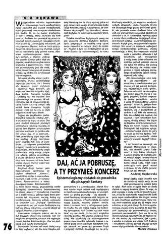 9. Под требующим обширных пояснений заголовком «Daj, ac ja pobruszę, a ty przynieś koncerz» печатается в рубрике «Felietony» «эпистомологическое приложение к пособию для писателей фэнтези» Анджея Сапковского (стр. 76).