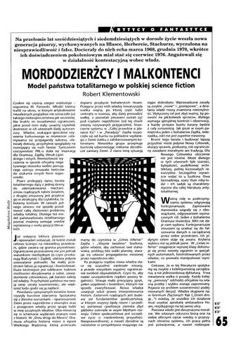 5. Далее Роберт Клементовский/Robert Klementowski в рубрике «Критики о фантастике» публикует интересную статью о представлении тоталитарных режимов в польской социальной фантастике. Статья называется «Mordodzierżcy i malkontenci» (кто бы попытался перевести название?) и в ней анализируются произведения Зайделя, Орамуса, Бялчиньского, Шулькина, Внук-Липиньского, Марковского, Паровского, Дышлевского и Нидецкой (стр. 65-68).