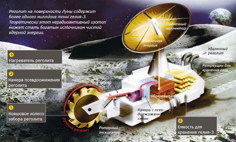 Гелий-3 исходит из Солнца и уносится в космос солнечными ветрами. Когда изотоп достигает Земли, атмосфера и магнитное поле защищают нашу планету от его выпадения —отсюда его незначительное количество на ней, в отличие от Луны, лишенной атмосферы и почти не имеющей магнитного поля. На протяжении миллиардов лет Луна подвергалась «бомбардировке» солнечными ветрами, а приносимые ими первоэлементы оседали в лунной пыли. Гелия-3 там достаточно для удовлетворения энергетических потребностей человечества на сотни лет. По оценкам одного из академиков, он может дать в десять раз больше энергии, чем все топливо, добываемое в земных шахтах.