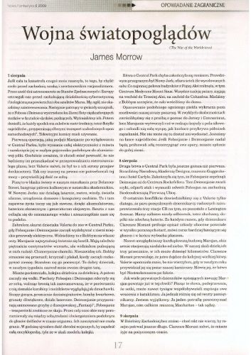 11.1. Рассказ американского писателя Джеймса Морроу/James K. Morrow, который называется в оригинале “The War of the Worldviews” (2002, ант. “Mars Probes”; 2002, ант. “SF: The Best of 2002”; 2004, авт. сб. “The Cat’s Pijamas and Other Stories”) перевела на польский язык под названием «Wojna światopoglądów/Война мировоззрений» ПАУЛИНА БРАЙТЕР/Paulina Braiter (стр. 17—23). Иллюстрации ДАРИИ МАЙ/Daria Maj.