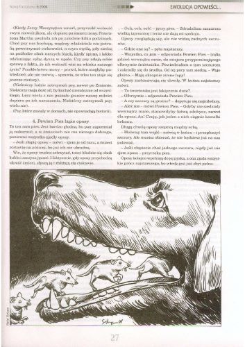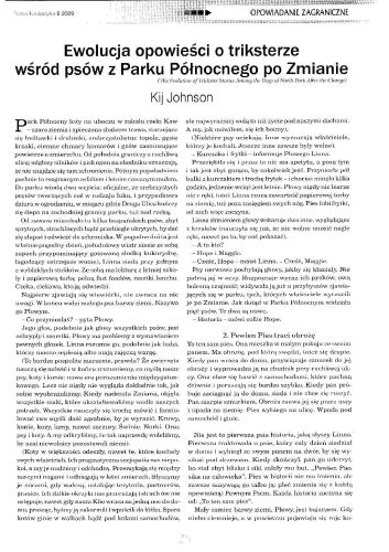 11.2. Рассказ американской писательницы Кидж Джонсон/Kij Johnson, который называется в оригинале “The Evolution of Trickster Stories Among the Dogs of North Park After the Change” (2007, ант. “The Coyote Road”; 2008, ант. “The Year’s Best Fantasy and Horror: Twenty-First Annual Collection”; 2012, авт. сб. "“All the Mouth of the River of Bees”), перевела на польский язык под названием “Ewolucja opowieści o tricksterze wśród psów z Parku Pólnocnego po Zmianie/ Эволюция сказок о трикстере, бытующих среди собак Норд-парка после Перемены»” ПАУЛИНА БРАЙТЕР/Paulina Braiter (стр. 24—24). Иллюстрации РАФАЛА ШЛАПЫ/Rafał Szłapa.