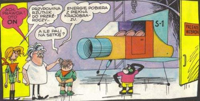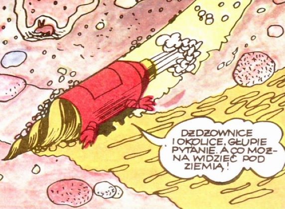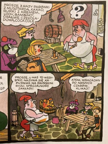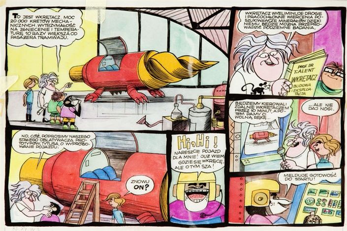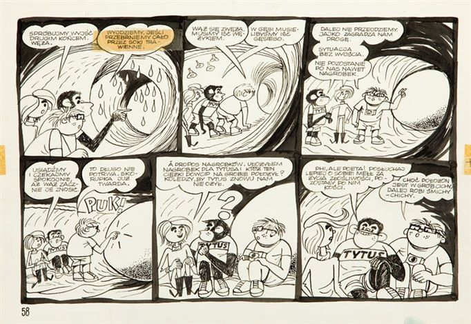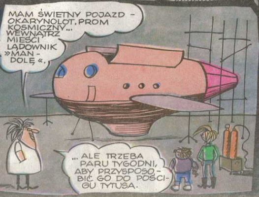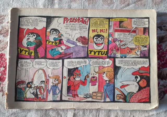 Может возникнуть искушение сказать, что именно фантастические элементы, как те, которые больше всего стимулируют воображение, сделали «Титуса» культовым комиксом. Космос, внедрение в кинофильмы и живописные картины, транспортные средства из предметов повседневного обихода, игра с абсурдом, забавные поговорки – вот элементы, увлекательные для молодежи докомпьютерной эпохи. Там, где ХМЕЛЕВСКИЙ описал действительность, он теперь либо стыдится ее и перерисовывает первые книги, удаляя все поклоны в сторону Польской Народной Республики, либо пытается эту самую действительность догнать, как в третьем десятке приключений. И тогда оказывается, что либо время идет слишком быстро, либо Титус больше не способен оправдывать ожидания сегодняшних получателей. В эпоху Ким Пять-с-плюсом, Лило и Стича, Скуби-Ду, где в значительной степени (хоть и не только!) речь идет о спонтанном пердеже, все новых и новых именах или продвижении нового гаджета, реальности нет места. Господствует развлечение, не ограниченное идеологией, партиями и мировыми событиями. Рулят планшет и графические программы. Тушь постепенно уходит в прошлое.