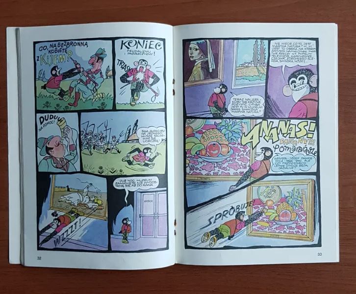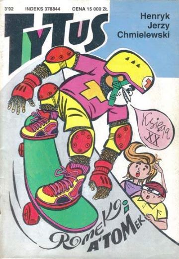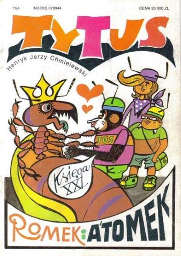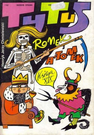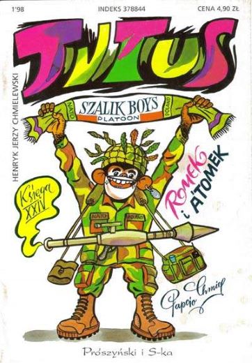 Попутно ПАПАША ХМЕЛЬ все больше теряет способность словотворчества, смена издателей вызывает изменение размеров альбомов (вопреки видимости, это серьезное обвинение среди художников комиксов), и XXXI книга имеет нечто общее с болельщиками только в своем названии. Тем не менее, ХМЕЛЕВСКИЙ (род. 1923) все еще творит, поэтому Титус не сказал последнего слова. Кто знает, может быть, мы ему еще поставим памятник. Ибо статьи в «Словаре детской и молодежной литературы» под редакцией Барбары Тылицкой и Гжегожа Лещиньского заслужили и автор, и персонаж. В этом должно же что-то быть.