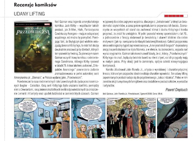 Нил Гейман и легенда американских комиксов ДЖЕК КИРБИ – соавтор таких персонажей, как Икс-Мэн, Халк, Фантастическая четверка и Мстители – имеют больше общего, чем вы думаете. Помимо того, что британец является большим поклонником достижений КИРБИ, ему также довелось дважды поработать над произведениями, художником которых был американец. Вначале Гейман сделал икону комикса из переделанного Песочного человека, которого КИРБИ рисовал в 1970-х годах. А два года назад автору «Сыновей Ананси» было поручено сделать ремастинг оригинального сериала американца под названием «Вечные» (“Eternals”), изданного в Польше под названием «Древние» (“Przedwieczni”).