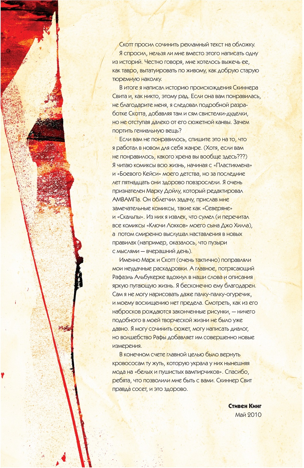 В книгу вошли первый и второй тома оригинального издания, а также примечания от переводчика, наброски к сценарию, эскизы, скетчи, галерея обложек, эксклюзивное превью – анонс третьего тома. И особенно ценные предисловие Стивена Кинга «Умойся кровью» и послесловие Скотта Снайдера к первой книге. В каждом из пяти выпусков первого оригинального тома «Американского вампира» одна история принадлежит перу Кинга, одна – перу Снайдера, образуя в последующем единую сюжетную линию. В дальнейшем сценарист Снайдер продолжил рассказывать историю американского вампира уже без Кинга, но и того зачина, который сделал король ужасов достаточно, чтобы Скиннер Свит стал пугающе настоящим.