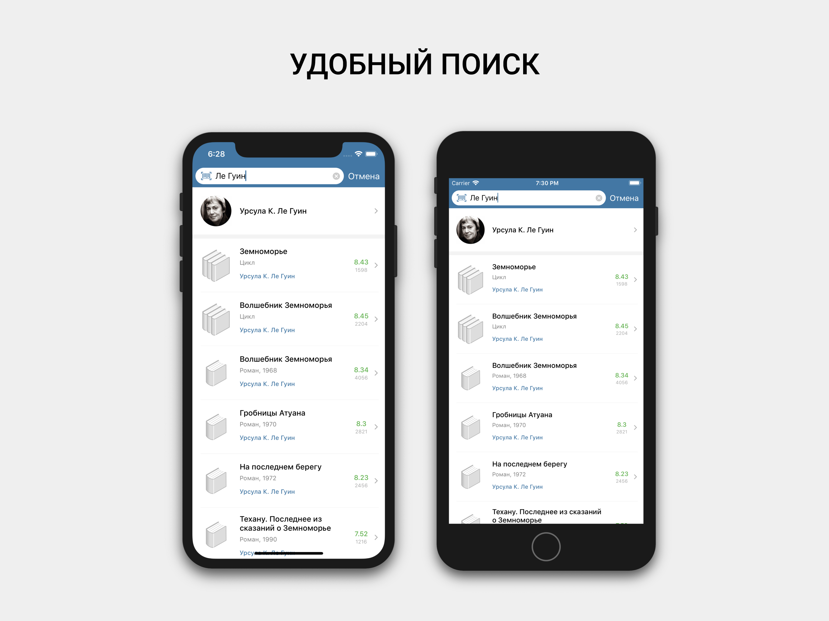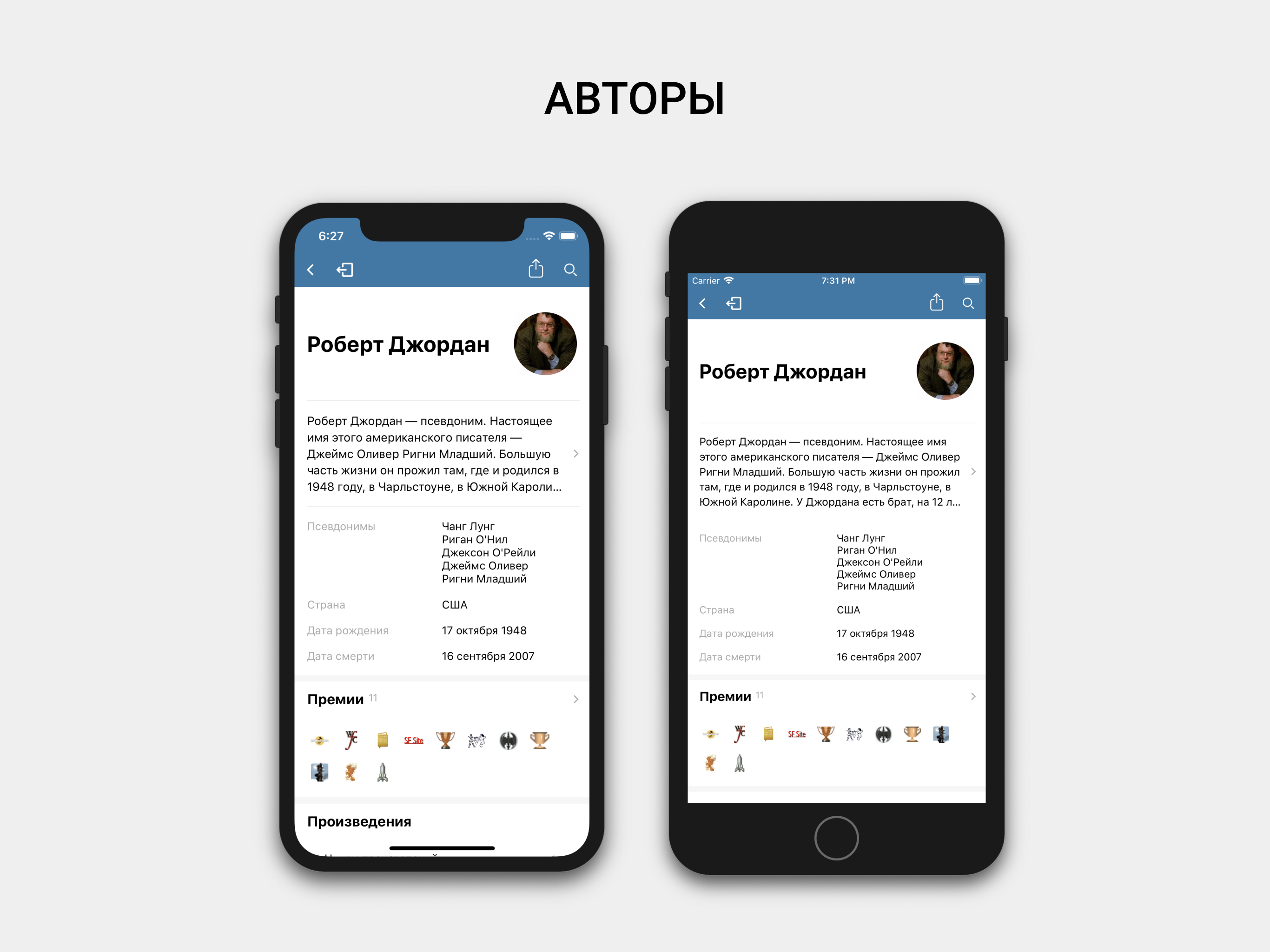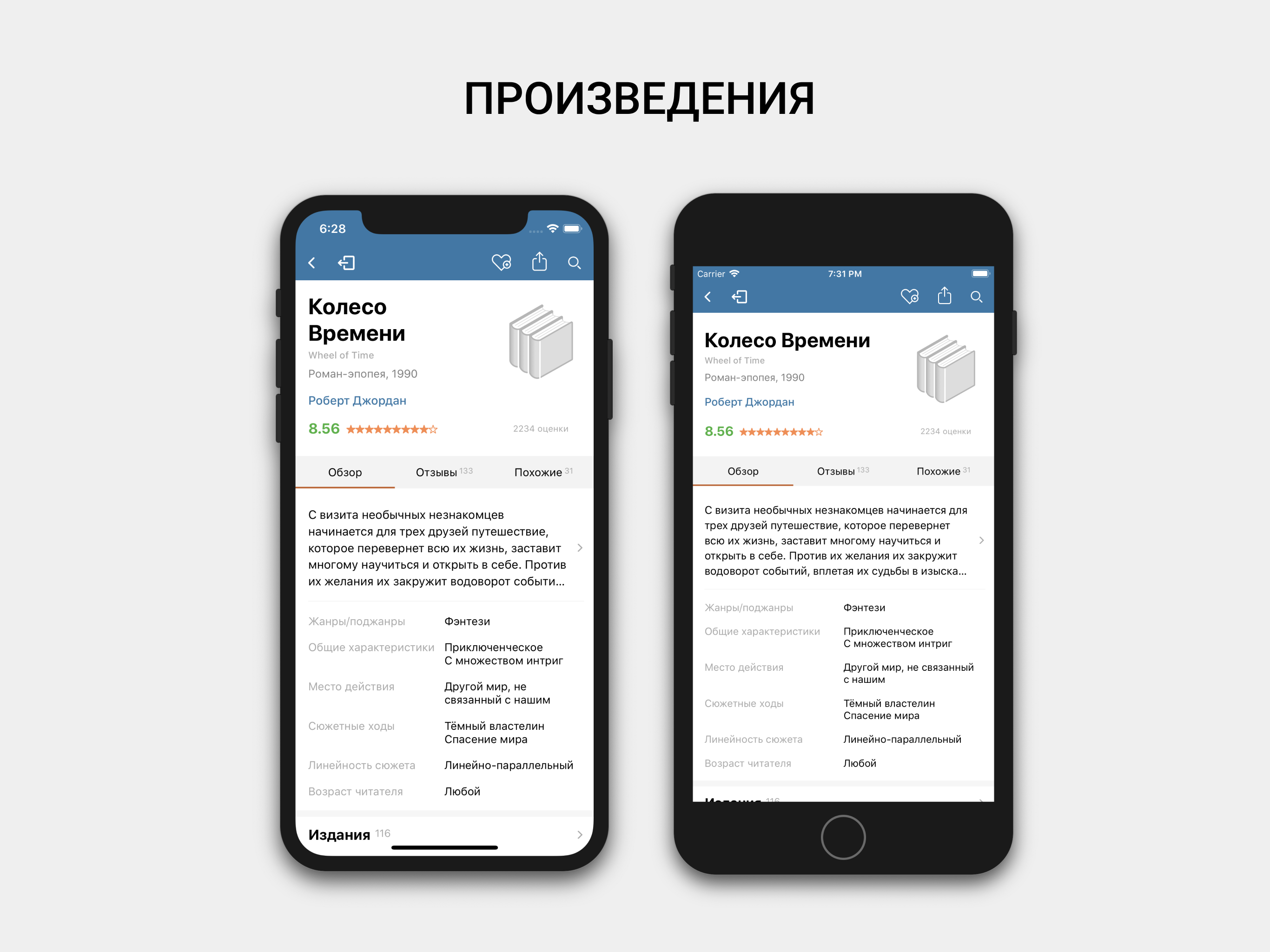 При проектировании карточек произведения, авторов, да и остальных экранов тоже, главной целью было компактно и наглядно представить запрашиваемую информацию — собственно, что во многом и требуется от мобильного клиента.
