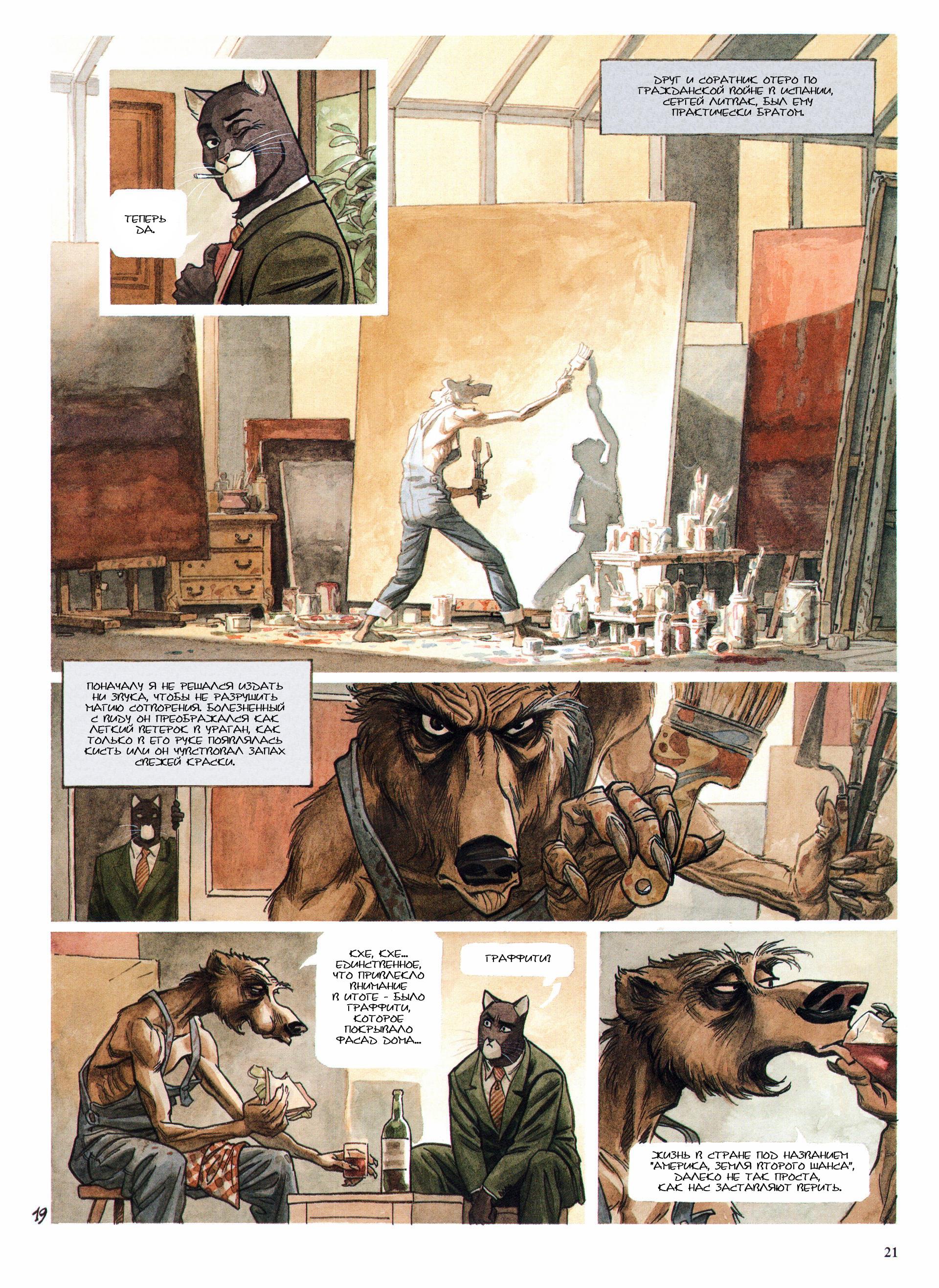 Вообще рисунок в любом европейском комиксе это совершенно особый разговор. В отличие от своих американских собратьев по кисти и перу делающих ставку на конвеерность (особенно в крупных издательствах), у европейцев процесс создания каждого выпуска это долгая и кропотливая работа нескольких человек. Именно поэтому BD отличает особая красота и техника изображения, с высокой детальностью прорисовки, и невероятно медленное производство. Но Блэксад даже на этом поле положил на лопатки всех, причем по обоим параметрам. Каждый из его 50-ти страничных выпусков делался по несколько лет, а последний — целых пять! Но это того стоило. В плане арта он просто безупречен и бесподобен. Выполненный в пастельных тонах, с пристальным вниманием даже к самым мельчайшим деталям, сохранением всех законов перспективы и игрой светотени. Каждая страница — это целое произведение искусства. Казалось бы, что еще нужно такому комиксу, для преодоления планки шедевра всех времен и народов? Всего-то хороший сюжет и персонажи. И если со вторым особых проблем не возникает, то сюжет увы местами буксует.