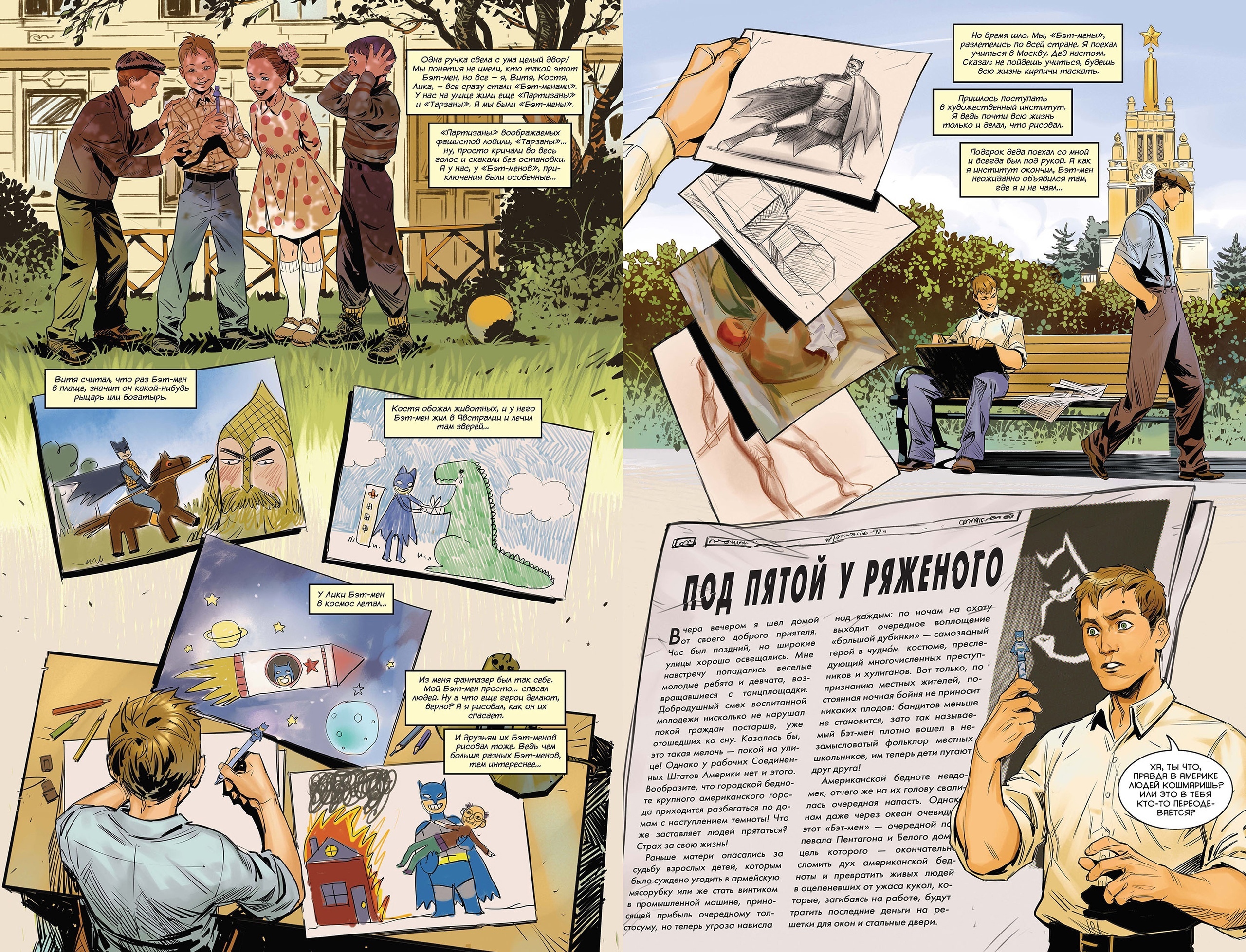 Но понятное дело, весь текст затевался ради наших ребят. Не знаю почему, может, для многих команд из других стран с более развитой индустрией комиксов это была работа, которую можно сделать на отвали, но наши выложились на полную. Рисунок Натальи Заидовой — одного из ведущих художников Bubble — очень чистый и приятный, при этом с собственным стилем. А сюжет порадует любого фаната «Бэт-мена» (да и вообще чего угодно), выросшего в советское и постсоветское время. Тогда не было этих ваших интернетов и любая крутая штука становилась сразу элементом устного народного творчества дворовой детворы, а после жила всю жизнь в сердце вчерашнего ребенка. Такой любовью и стал для главного героя Бэтмен, пройдя с ним через всю жизнь, за которой мы и понаблюдаем. Получился трогательный комикс с настоящим «русским духом», который ещё и умудряется активно играть в постмодернизм, пряча то тут, то там различные отсылочки и иронично подтрунивая над возрастом Бэтмена в конце. За это, скорее всего, стоит сказать спасибо одному из сценаристов Кириллу Кутузову, который читал лекции по истории комиксов, когда это не стало мейнстримом.