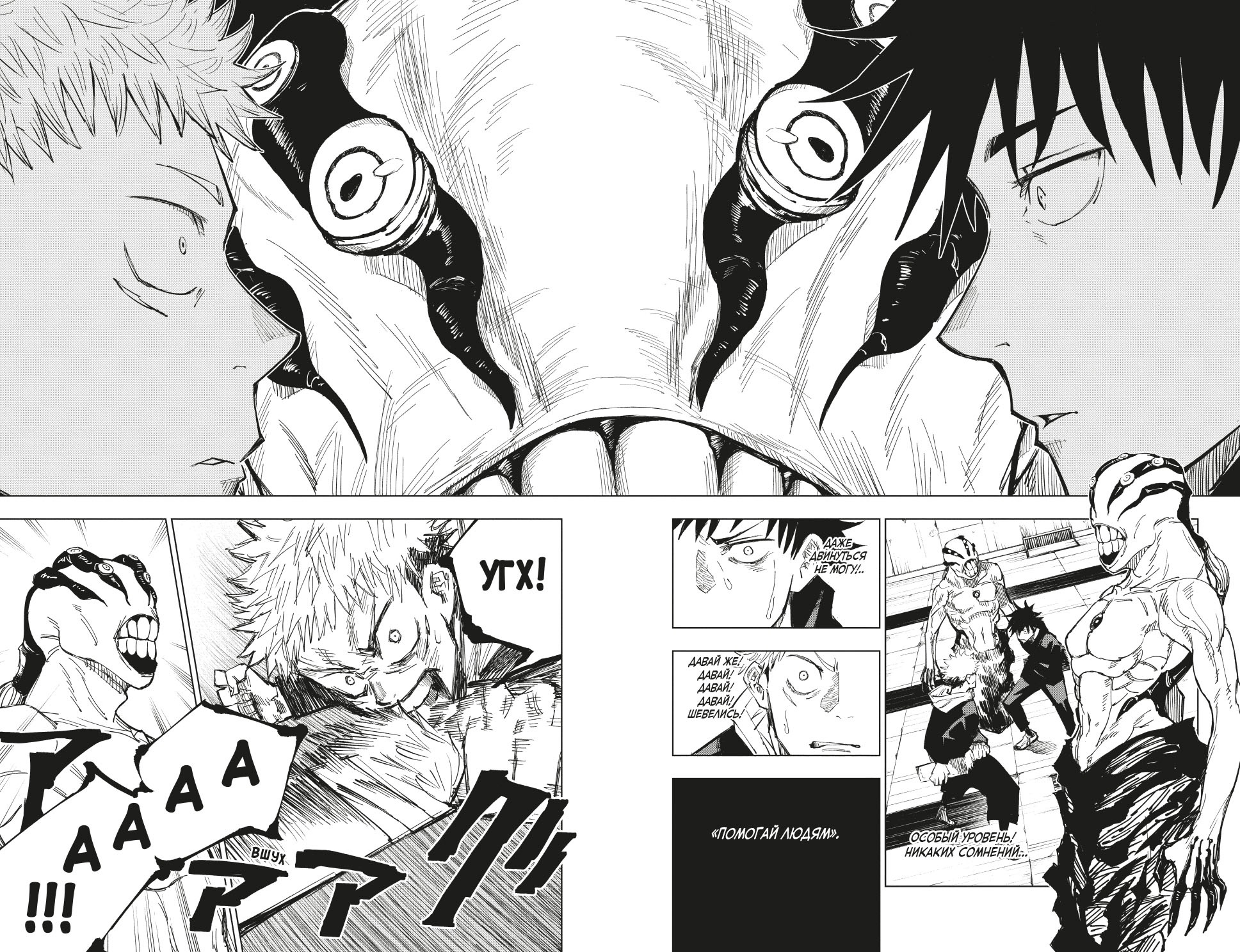 Хотя начало у истории Юдзи, как ни крути, слабовато. Крутость героя ничем особо не объяснена и вызывает много вопросов, равно как и его мотивация. Смерть дедушки — единственного опекуна, которая вроде как служит триггером для определения морального ориентира Юдзи, вообще исполнена максимально по-идиотски и совсем не работает. Но мангака довольно быстро понимает — его повело не туда и выправляется. Ко второму тому (по оригинальной нумерации) серия активно начинает работать на расширение мира и углубление характеров персонажей. Появляются новые герои и противники, на проработку каждого из которых автор не скупится и уделяет этому достаточно времени. Мой фаворит — маг, который хотел забить на всё это и стать офисным планктоном, но решил вернуться. Теперь охотится за проклятиями, как на работу ходит. В истории возникает сразу несколько конфликтов. Первый, внутри сообщества магов, где нет единого мнения по поводу Юдзи — разрешить ли ему продолжить собирать части великого Сукуна или устранить от греха подальше. Второй, с антагонистом приквела и могущественными проклятиями, ратующими за новый мировой порядок, ключем к которому становится опять-таки герой. К концу изданного второго тома (в нашей нумерации) Юдзи уже успел столкнуться с ними и впереди его ждёт программа по обмену опытом (читай состязание) с другим Магическим Колледжем. Увы, его студентам приказали устроить «сосуду Сукуны» несчастный случай.