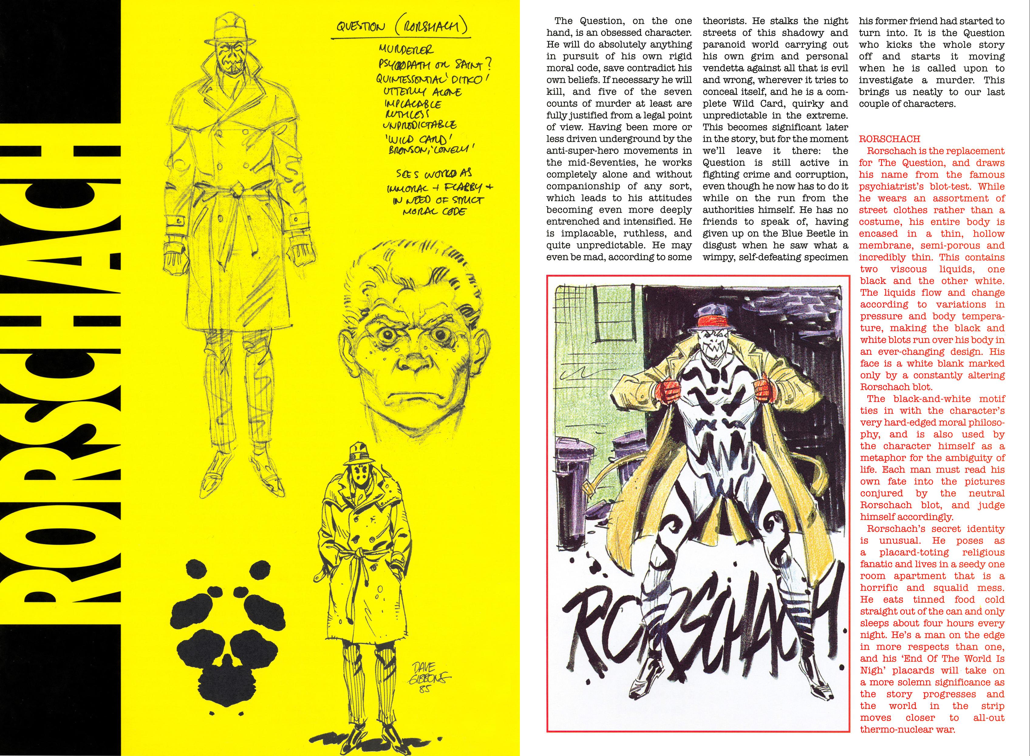 Алан Мур и до выхода Хранителей был фигурой знаковой. Многие его работы в DC до сих пор считаются каноническими, но именно после Watchmen, на которых его вдохновил 1984 Оруэлла, он приобрел действительно культовый статус. Как и сам комикс (На сколько я знаю, словосочетание "Графический Роман" имеет с Муром мало общего. Это всего лишь рекламный ход маркетологов, призванный сломить ментальный блок многих людей, неодобрительно фыркающих при слове "комикс"). И ведь есть за что. Даже если не особо копать вглубь, то Хранители — это умное произведение о людях и феномене супергеройства. И в комиксе этот феномен подробно рассматривается с двух сторон. Первый взгляд — это Ополченцы (Minutemen) Небольшая горстка людей действительно избрала рисованный истории о Ламонте Кренстоне-Тени и Супермене за источник вдохновения и решила бороться с преступностью аналогичными методами. Здесь Мур рассматривает и моделирует подобное развлечение в рамках чистого реализма, когда ни у кого нет никаких сверх способностей и единственное, что отличает их от обычных людей — это отличный хук слева. Причем действительно моделирует, вплоть до мельчайших деталей. В Записках Под Капюшоном (под Маской), которые занимают всего-ничего от общего объема, все продумано с невероятной тщательностью: выбор костюма, психологические проблемы, маркетинг и PR, условности этой "профессии" и многое другое. Мур даже придумал в какую сторону пойду привычные комиксы, когда реальные герои устареют вместе с вымышленными. Вторая сторона — это собственно Хранители-Часовые-Watchmen. Которая уже в большей степени является карикатурой на привычных для того времени супергероев из комиксов (правда боюсь, что сейчас многих из них уже и не узнать, разве что косвенно, но общие архетипы остались) Ночная Сова II — Синий Жук (а не Бэтман, как всем казалось), Манхэттан — Капитан Атом, у остальных свои прототипы. При чем карикатура это хоть и весьма злая, один очерк из Нового Дозорного чего стоит, но все же приправленная неким налетом печали и грусти, когда человек отдает дань памяти героям своего прошлого, которые уже давно потеряли свой блеск. Карикатура-карикатурой, но думаю ни для кого не секрет, что персонажи в Хранителях выписаны просто блестяще. Подробно писать о личных завихрениях каждого мне кажется бессмысленно, все и так всё знают. Достаточно сказать, что за каждым из них стоит своя история и свои мотивы, а вороху тараканов в голове позавидует иной учебник по психологии, и даже второстепенным персонажам придается огромное значение. Хотя в Хранителях вообще нет второстепенных персонажей, Мур создал такую историю, в которой даже простой прохожий играет свою трагичную роль в общей пьесе. Вспомним хотя бы Макса Ши (Интересно каким далеким родственником ему приходится Майкл?