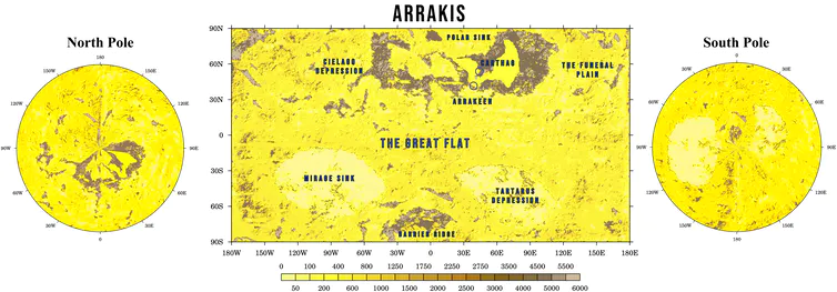 Герберт пишет, что на Дюне не идет дождь. Однако модель исследователей предполагает, что на планете будет выпадать небольшое количество осадков, только в более высоких широтах летом и осенью и только в горах и на горных плато.