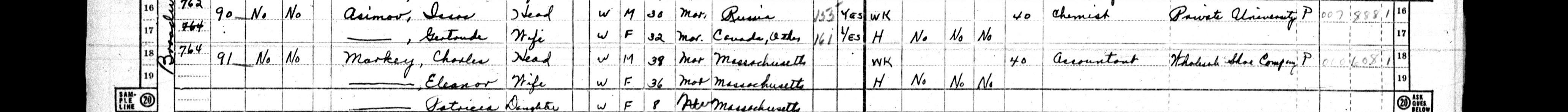 Из данных анкеты мы видим номер дома и квартиры, где проживал Айзек со своей первой женой Гертрудой в 1950 году, их возраст, место рождения, где, кем и сколько часов в неделю работают. Честно скажу, что не было времени поискать других великих фантастов, если вдруг кто-то еще найдет что-нибудь интересно, пишите в комментариях.