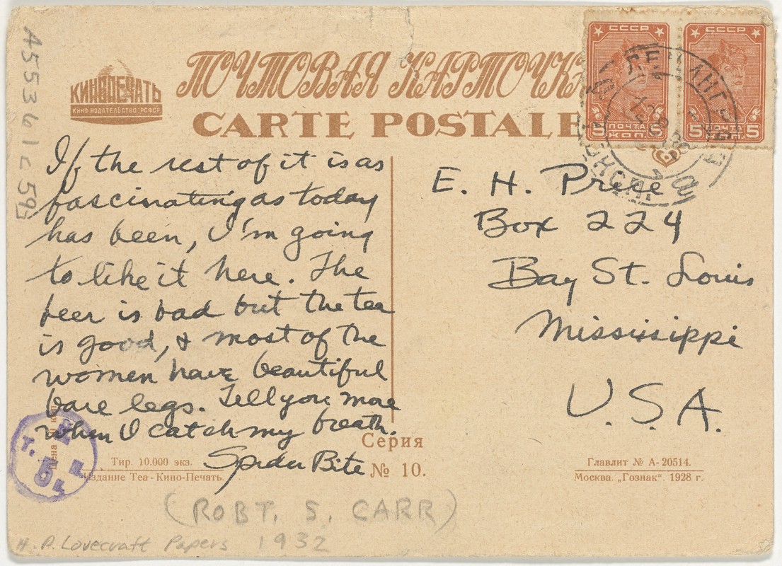 Оборотная сторона открытки, обратите внимание на карандашную пометку внизу слева — из бумаг Лавкрафта