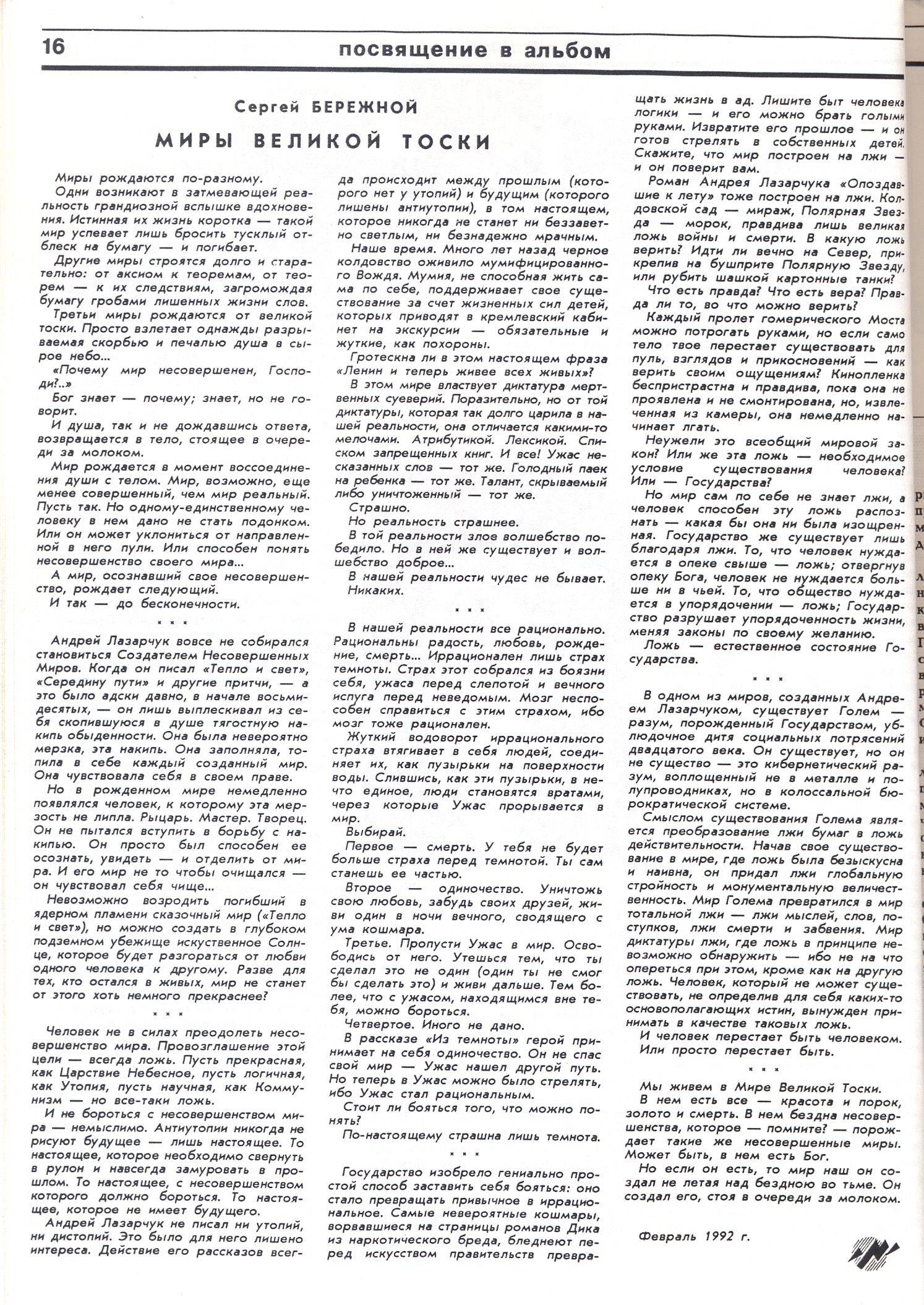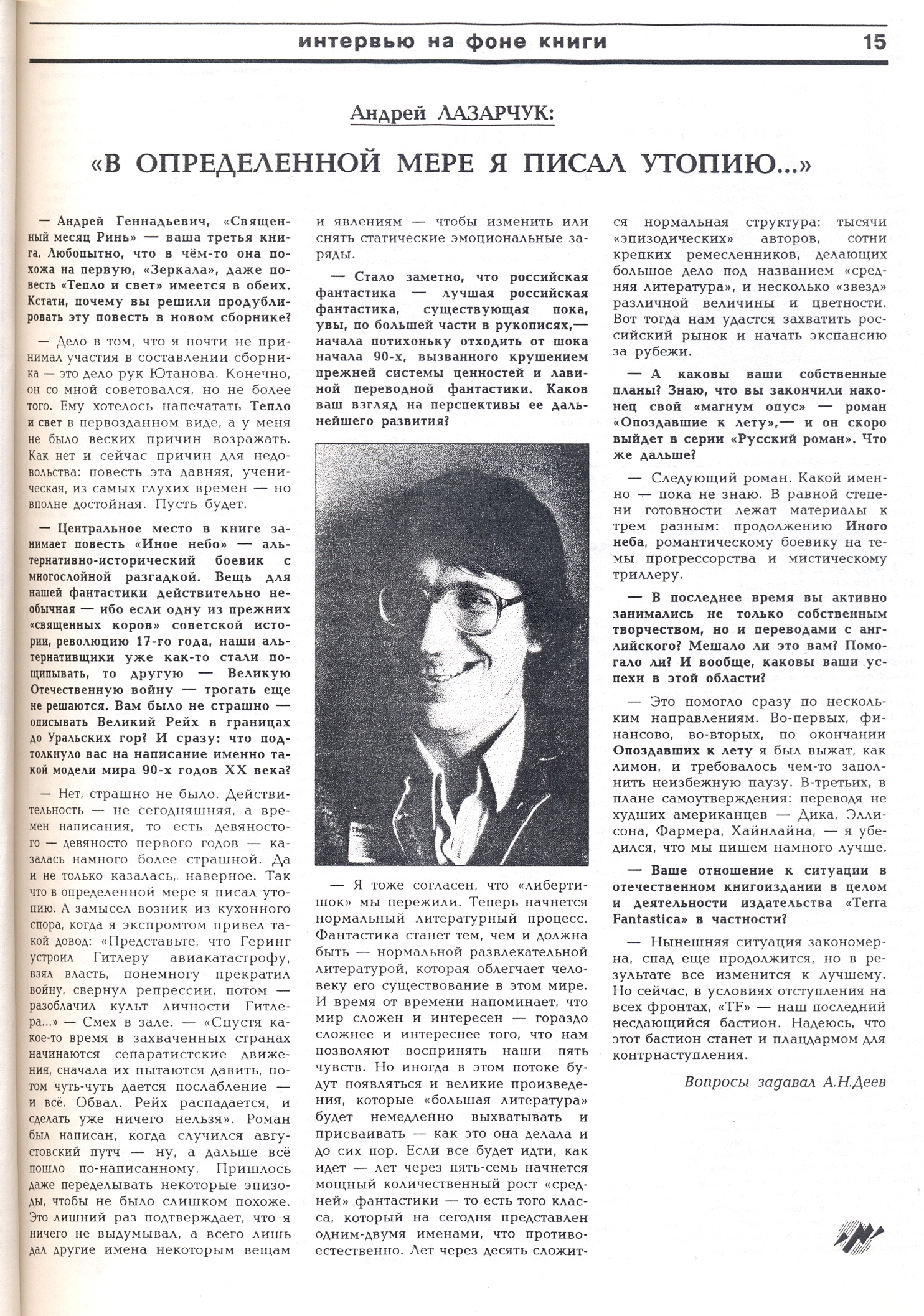 Две страницы этого номера "Интеркома" были посвящены Андрею Лазарчуку — только-только восходившей тогда звезде российской фантастики из сибирского города Красноярска. Первая страница — это небольшое интервью, которое взял у писателя мой альтер-эго А.Н.Деев (в основном, по поводу его сборника "Священный месяц Ринь" и повести "Иное небо"). А вторая страница из того же номера — это мини-эссе, которое наваял об Андрее Лазарчуке мой постоянный напарник по фэнзинёрским делам Сергей Бережной: