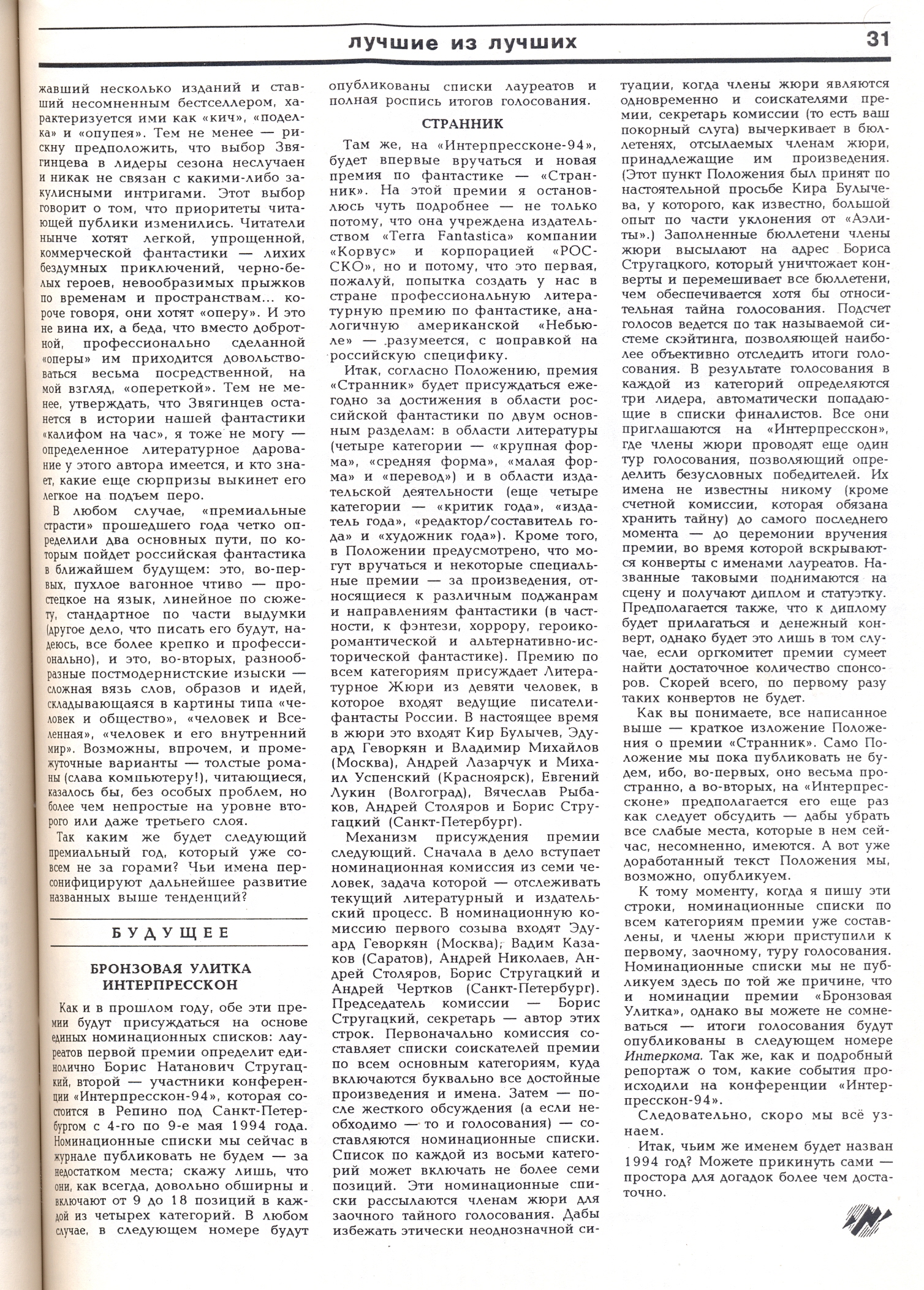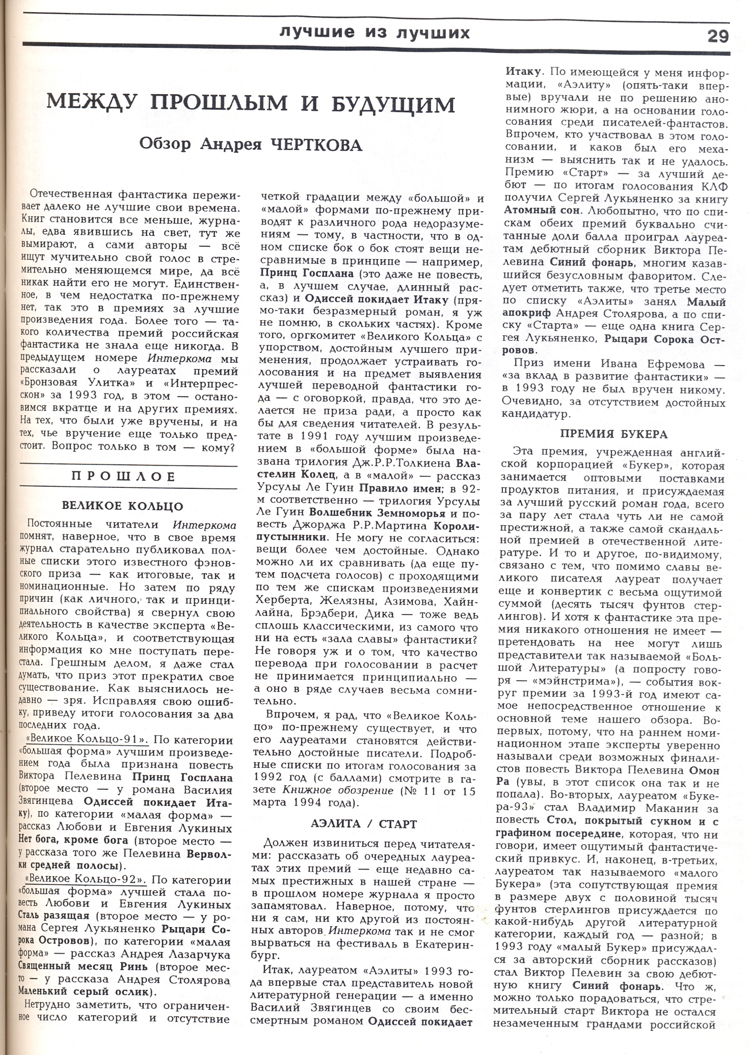 Это был, казалось бы, совершенно проходной материал — о лауреатах литературно-фантастических премий 1992-1993 годов и премиальные прикидки на наступивший 1994 год, — а ведь на самом деле именно тогда заваривались все те зубодробительные конфликты, которые сотрясали нашу фантастику всю вторую половину 90-х годов и даже далее. Достаточно вспомнить, например, весьма скандальное присуждение премии "Странник" на "Интерпрессконе" 1994 года, главными героями которого стали Андрей Столяров и Андрей Лазарчук. Правда, "Интеркомъ", прекративший своё существование как раз на данном номере, этот скандал уже не отслеживал — даже в своих достаточно скучных вкладках в журнале "Если" 1995 года (главред "Еслей" Александр Шалганов все эти писательско-фэновские разборки просто не понимал и на "жареную" информацию в своем журнале моментально наложил вето). Зато выпавшую из рук "Интеркома" свечу (вместе с канделябром) очень быстро подхватили Андрей Николаев и Сергей Бережной в своём пародийном фэнзине "Оберхам", молниеносно — всего через один номер — трансформировавшемся в весьма респектабельный журнал "Двести". А вот уж в "Двестях"-то литературные скандалы раздували как могли — никому мало не показалось. Кстати, могу предположить, что именно тот полувооруженный конфликт, разгоревшийся на "ИПК-94", в значительной степени и привёл к тому, что разозлившиеся московские фэны из клуба "Три парсека" создали в итоге свой "всесоюзный" конвент "РОСКОН" с соответствующими призами, которые, надо полагать, вручаются куда справедливее, чем "волюнтаристские" "Интерпресскон" и "Странник" (если кто не понял — тут табличка "сарказм"). Уж мне ли об этом не знать...)))
