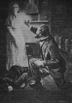 Изображение слева: учёный и спиритуалист сэр Уильям Крукс, медиум Флоренс Кук и призрачный дух "Кэти Кинг" во время эксперимента по материализации формы (рисунок).
