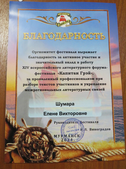 Как и годом ранее, на вечере блистала Елена Шумара. Кроме участия в нескольких солидных коллективных сборниках, она получила, по меньшей мере, восемь дипломов. Это диплом лауреата Международного творческого симпозиума «Волошинский сентябрь» в номинации «Всех миров преображенье…» (журнала «Дружба народов») — за рассказ «Не любила», диплом лауреата I премии XII Международного конкурса рассказа им. В.Г.Короленко — за рассказ «Маха», диплом победителя конкурса «Все счастливые семьи» — за рассказ «Маха», диплом Международной премии «Диас» в номинации «Судьба», диплом лауреата II степени VIII Международного поэтического конкурса памяти Константина Васильева «Чем жива душа…», диплом лауреата Всероссийского поэтического конкурса «Бессонная любовь» (памяти Любови Бессоновой), диплом III степени XXV Международного фестиваля литературы и культуры «Славянские традиции-2024» в номинации «Поэзия, свободная тематика» — за многолетнюю плодотворную творческую деятельность и помощь в проведении фестиваля, Благодарность оргкомитета XIV Всероссийского литературного форума-фестиваля «Капитан Грэй» — за проявленный профессионализм при разборе текстов тексте участников и укрепление межрегиональных литературных связей. Чего только не узнаешь о творческой жизни в стране, не выходя из Дома писателя!..