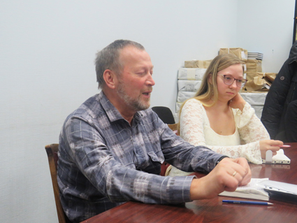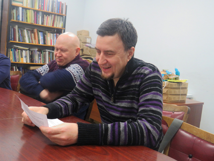 Затем студийцы начали зачитывать свои тексты. У Валерия Шлыкова в диалоге участвовали сразу четыре персонажа: уголовник, профессор, ответственный работник и дурачок, который в конце концов попал в рай. Вадим Кузнецов тоже не ограничился двумя персонажами, что было бы куда проще, а замахнулся на четверых. Он написал историю о трех гномах и драконе. У него в тексте было очень много авторской речи, а значит, нарушено главное требование задания. По ходу обсуждения написанного им диалога возник разговор о речевой доминанте.